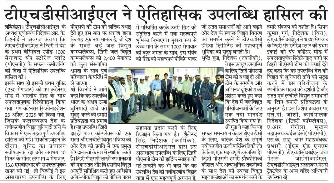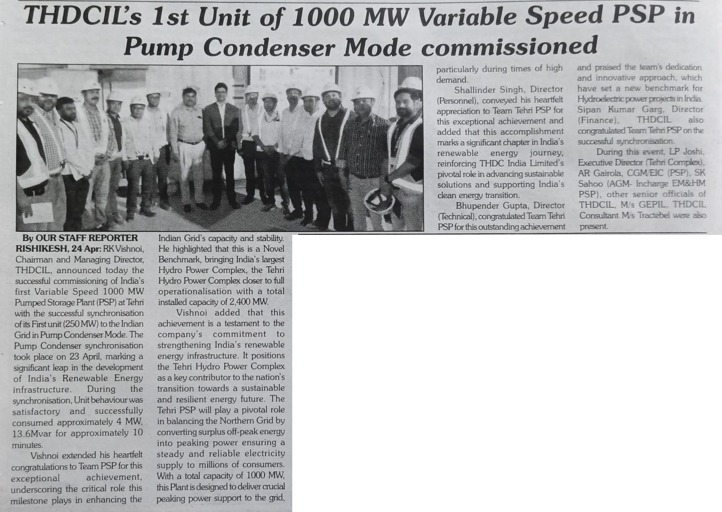 Rishikesh, 24-04-2025: Sh. R. K. Vishnoi, Chairman and Managing Director, THDCIL announced historic achievement towards successful commissioning of India’s first Variable Speed 1000 MW Pumped Storage Plant (PSP) at Tehri with the successful synchronization of its First unit (250 MW) to the Indian Grid in Pump Condenser Mode. The Pump Condenser synchronization took place on 23rd April 2025, marking a significant leap in the development of India’s Renewable Energy infrastructure. During the synchronization, Unit behaviour was satisfactory and successfully consumed approx. 4 MW, 13.6Mvar for approx. 10 minutes.