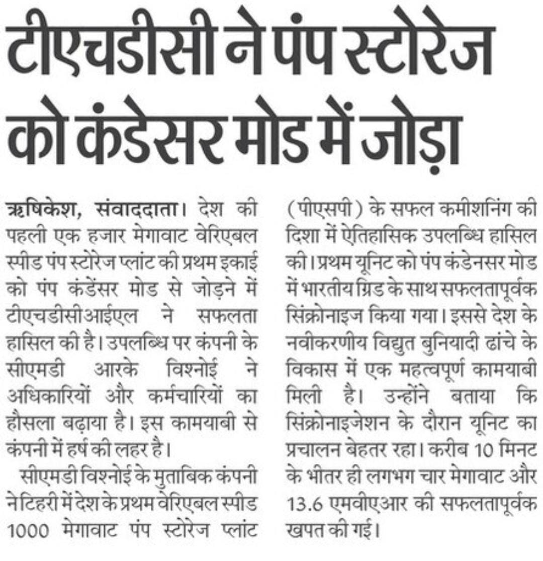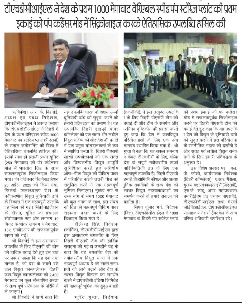 Shri Vishnoi further added that this achievement is a testament to our commitment to strengthening India’s renewable energy infrastructure. It positions the Tehri Hydro Power Complex as a key contributor to the nation’s transition towards a sustainable and resilient energy future. The Tehri PSP will play a pivotal role in balancing the Northern Grid by converting surplus off-peak energy into peaking power ensuring a steady and reliable electricity supply to millions of consumers. With a total capacity of 1000 MW, this Plant is designed to deliver crucial peaking power support to the grid, particularly during times of high demand.